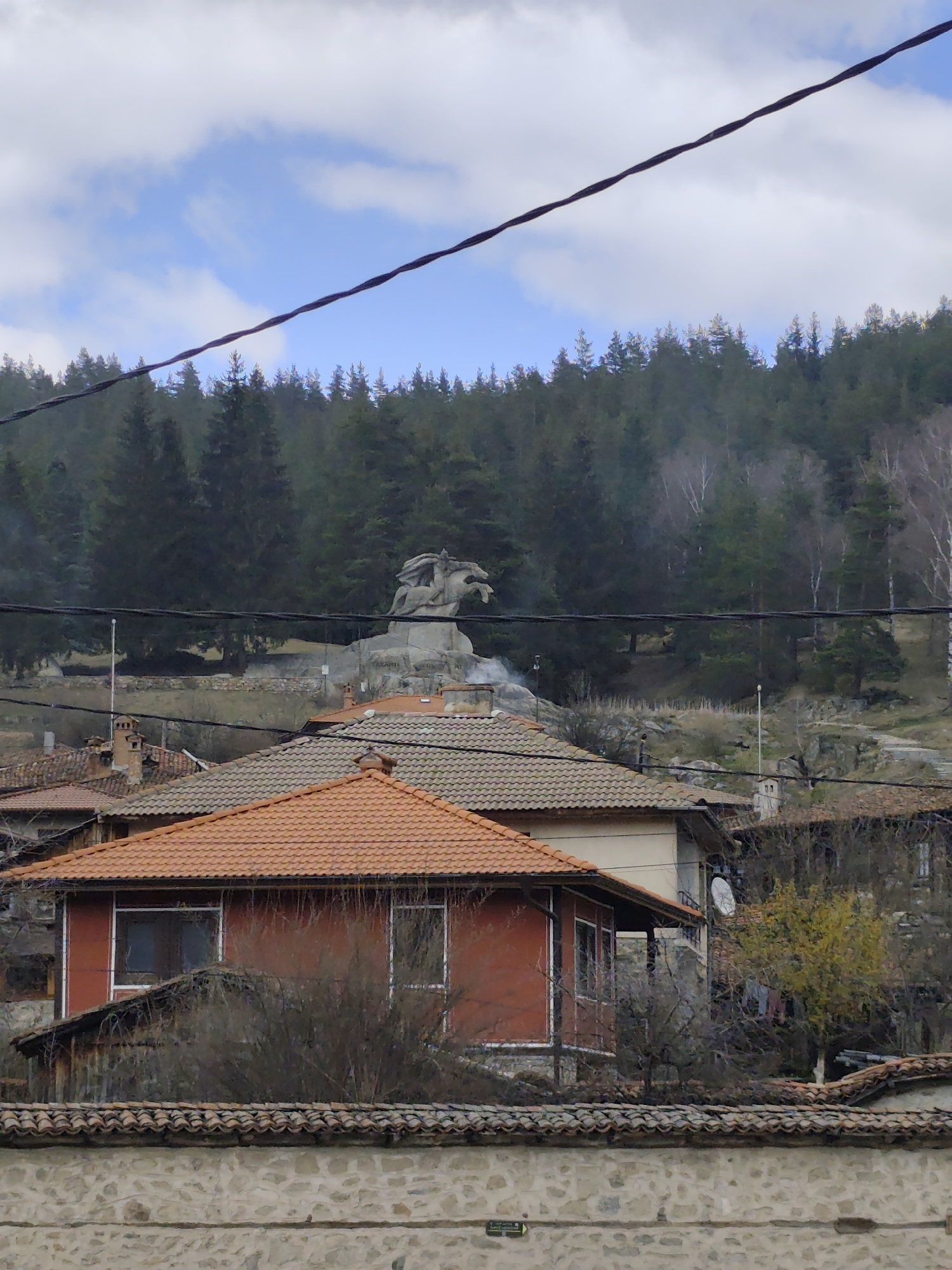 The image displays a panoramic view of Koprivshtitsa, Bulgaria, featuring traditional architecture against a natural backdrop under a partly cloudy sky. In the upper-mid ground, a prominent stone monument of a rider on horseback stands atop a rocky hill, backed by a dense evergreen forest. Below the monument and forest, several traditional Bulgarian houses are visible, characterized by their reddish-orange terracotta tiled roofs and various wall colors, including reddish-brown and beige. One house in the lower-mid ground features two white-framed windows. Multiple chimneys protrude from the rooftops. In the immediate foreground, a textured stone wall with a tiled coping runs horizontally across the bottom of the frame, partially obscuring the lower portions of the houses. Sparse, bare deciduous trees and shrubs are scattered around the houses and on the hillside. A small tree with yellowish-green leaves is present on the right. Several dark electrical or communication wires traverse the scene horizontally at different elevations. No individuals are visible, and no active interactions are depicted.