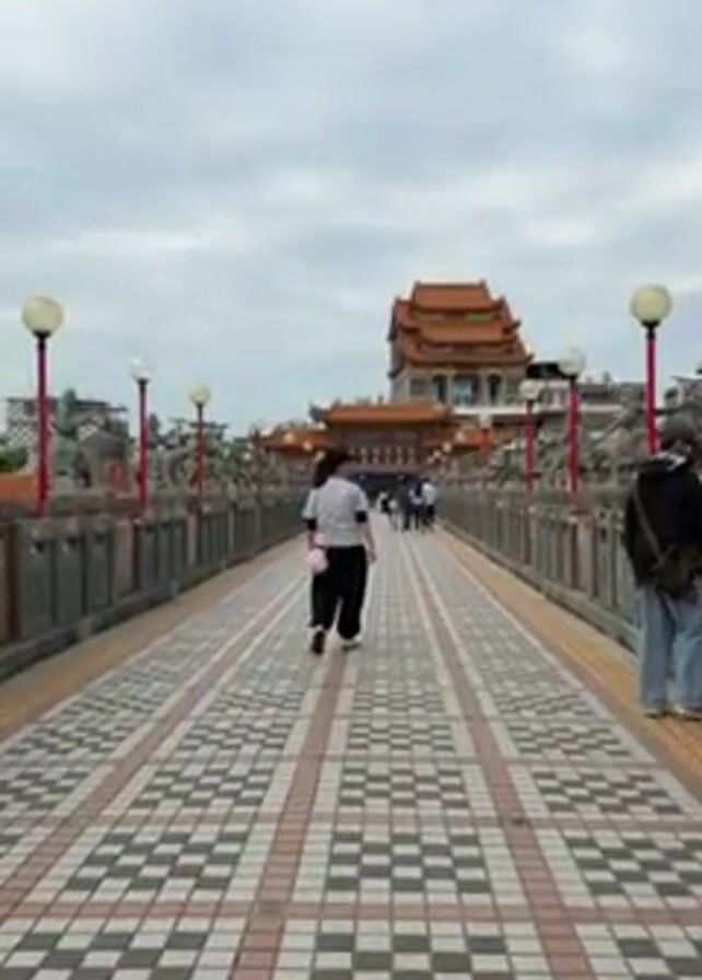 woman walking away from the camera along a decorated walkway towards a traditional-style building. The walkway has a checkerboard tile pattern in shades of brown, white, and gray, and is flanked by a low wall with decorative elements and vintage-style lampposts. Other people are visible in the distance also walking along the path. The sky is overcast. The building at the end of the walkway appears to be a temple or similar structure with multiple levels and an orange roof.