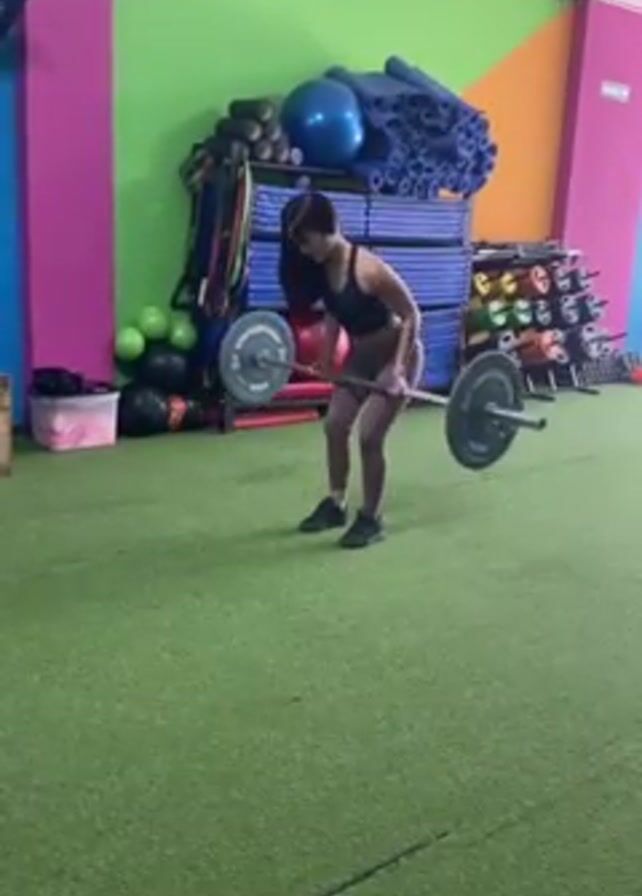 woman in a gym setting doing a barbell exercise. The woman is wearing a black sports bra and brown leggings. She has brown hair pulled back. She is standing in front of a barbell with weights on each side. The gym has a green floor and colorful walls. There are various pieces of gym equipment in the background. The woman bends at the waist and lifts the barbell, keeping her back straight. She then lowers the barbell back to the ground. She stands up and then makes a hand gesture.