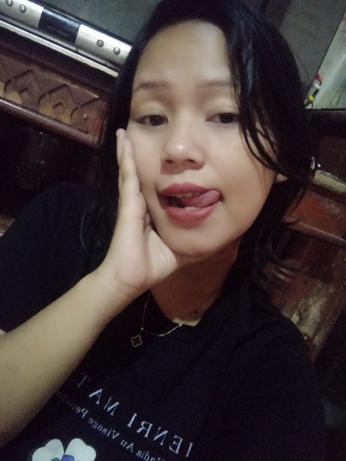 A young woman poses for a selfie. Her black hair is pulled back, and she wears a black t-shirt with white writing and floral details. She is sticking her tongue out and touching her cheek with her hand. A gold necklace with a clover pendant is visible. The background includes dark wood furniture, creating an indoor setting.