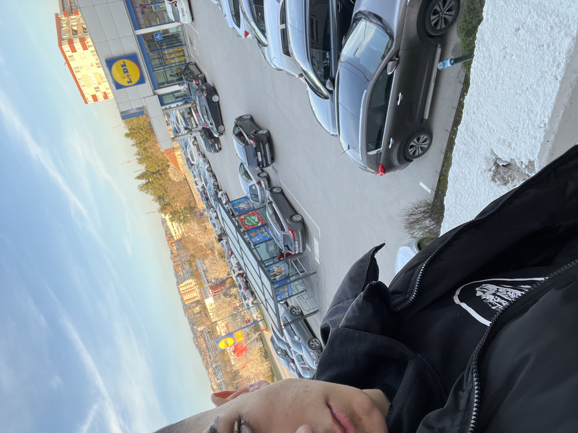 The image is a selfie taken from an elevated position, looking down at a Lidl supermarket in Veliko Tarnovo, Bulgaria. The photograph captures a parking lot filled with several cars. The Lidl building is visible with its distinctive yellow and blue logo. A person is shown partially in the foreground, wearing a black jacket. The background reveals a cityscape with buildings and a clear sky.