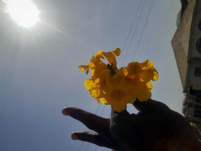 The image depicts an outdoor scene under a clear, bright blue sky with intense sunlight emanating from the upper right, producing a prominent starburst effect. The location is described as the city of Jos, Nigeria, although no specific geographical landmarks are visually identifiable within the frame. In the foreground, a dark-skinned human hand is positioned on the left, holding a dense cluster of bright yellow, trumpet-shaped flowers. Several flowers are visible, displaying faint reddish-orange striations within their petals. The hand is partially obscured by the flowers. In the lower background, several indistinct residential buildings are partially visible, featuring light-colored walls and sloped roofs, with one structure exhibiting a prominent peaked roof. Faint horizontal lines, consistent with utility wires, are discernible against the sky in the mid-ground.