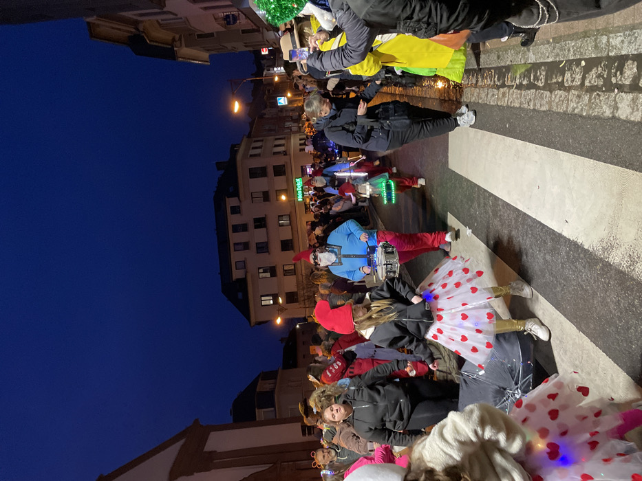 The image depicts a nighttime street scene in Colmar, France, during what appears to be a parade or festive event. The sky is a deep twilight blue, and artificial streetlights cast a yellow glow across the urban environment. In the immediate foreground, a pedestrian crosswalk with white stripes spans a wet asphalt street. Numerous individuals populate the scene, many in costume. A young female in the central foreground wears a black jacket, gold leggings, and a white tutu-style skirt decorated with red hearts, several of which are illuminated with blue lights. She also wears a tall red conical hat, resembling a gnome. To her right, a male figure dressed in a light blue tunic, red pants, a long white beard, sunglasses, and a similar red gnome hat, actively plays a snare drum suspended from his neck. Behind him and slightly to his right, a smaller individual in a red hat and costume also holds a drum, displaying green illuminated elements on their side. Another male in a blue tunic and red pants, with a white beard and red hat, follows further back. On the left side of the frame, a female in a black hoodie and dark pants stands amidst other blurred figures. On the far right, part of a bright green sparkly hat is visible, alongside an individual in a yellow garment holding a smartphone aloft, seemingly capturing the event. Next to them, a woman in a dark blue jacket and pants looks down, possibly interacting with an object in her hands. The background features multi-story buildings lining the street. A prominent green sign displaying "PHOTO DELUX" is visible on a building on the right side of the street. On the far left, a large, historic stone building with distinct architectural elements, identifiable as the Collégiale Saint-Martin de Colmar, stands against the dark sky. The overall scene suggests a vibrant public celebration or procession in a city setting.