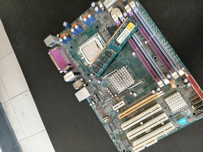 motherboard with various components. At the top center is a CPU socket with a CPU installed. A stick of RAM is placed diagonally across the CPU. There are multiple PCI slots at the bottom, and four RAM slots at the top right. A heatsink is located in the center, below the CPU socket. Various connectors are visible on the left side of the board. The motherboard appears to be used and slightly dusty.