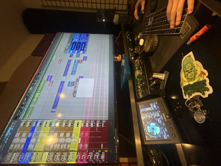 The image depicts a music production studio desk located in Saint-Ouen-sur-Seine, France