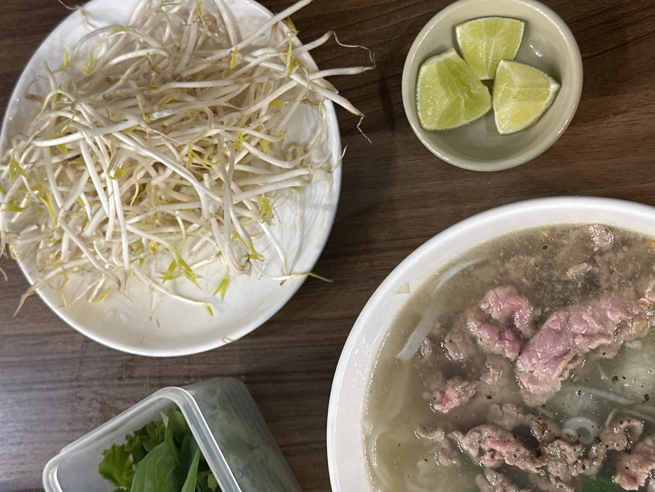 A top-down, static photograph captures a Vietnamese meal arranged on a dark brown wooden table in Nha Trang, Vietnam. A white ceramic bowl, partially visible in the bottom left, contains pho, characterized by a light brown broth and multiple slices of cooked beef, some exhibiting pinkish interiors, alongside white rice noodles. To the upper right of the pho bowl, a white oval-shaped plate is heaped with a substantial quantity of fresh, pale white mung bean sprouts. Directly below the sprouts, in a small, light beige ceramic bowl, rest three bright green lime wedges. A clear plastic container holding fresh green leafy herbs is partially visible in the top left quadrant of the image. No individuals are present in the frame. The items are positioned as if prepared for consumption, indicating a typical dining setup.