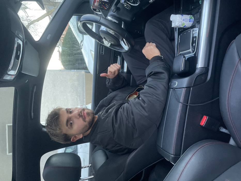 A male individual, estimated to be between 20 and 35 years of age, with short light brown hair and a trimmed beard, is seated in the driver's seat of a black Mercedes-Benz vehicle