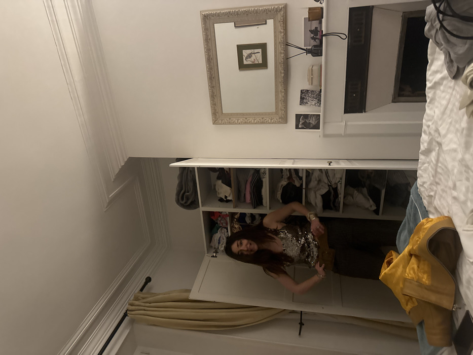 A woman with long brown hair poses in front of an open closet. She wears a silver sequined top and dark pants. The closet is filled with various items of clothing. Behind the closet is a white wall with a mirror and other decorative items. To the right, a bed is covered with a white duvet and a yellow jacket. The room appears to be a bedroom with angled ceilings.
