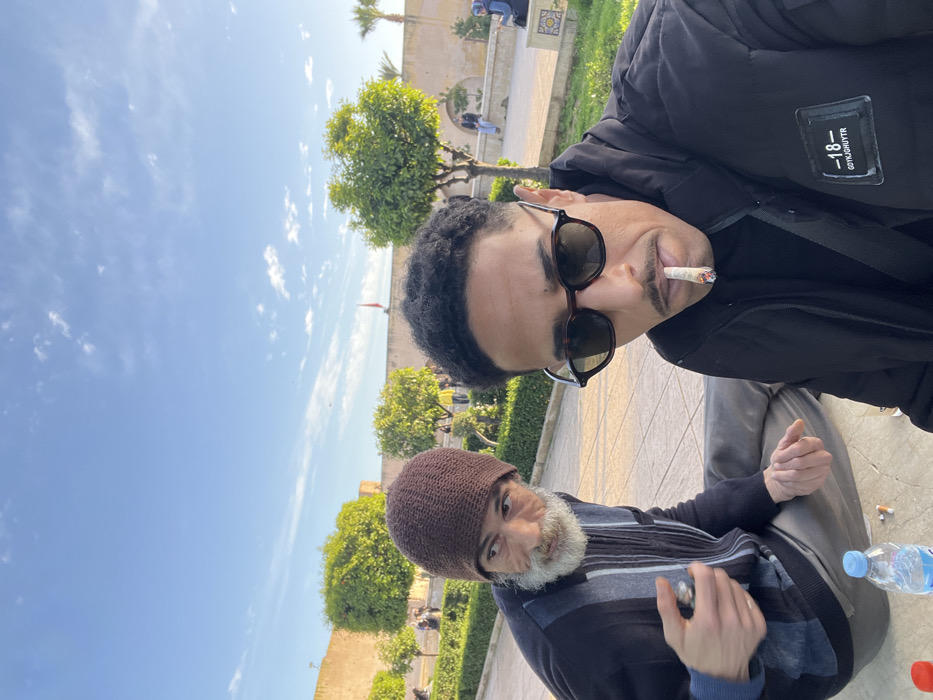 - "The image, taken from a low-angle selfie perspective, depicts two men seated outdoors in Al Machouar – Stinia, Morocco, under a clear blue sky with sparse white clouds" by FM-Gn7EC2, licensed under CC BY 4.0