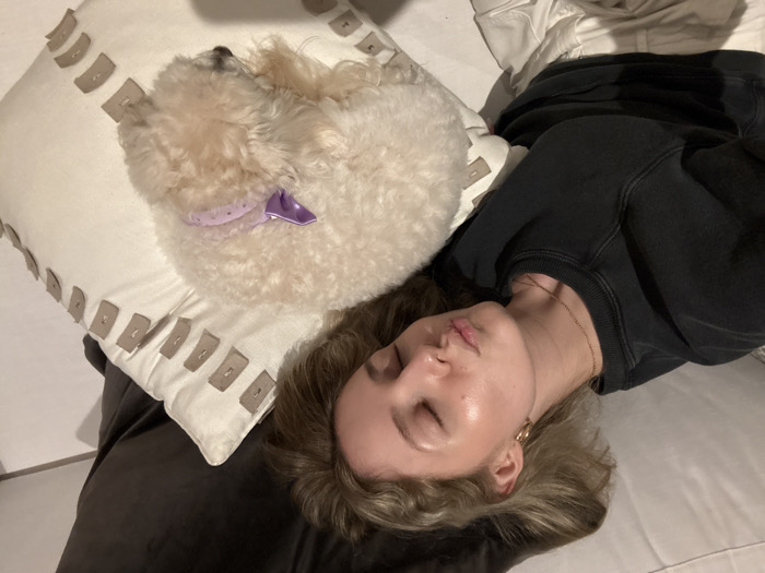 An indoor scene depicts a young female and a small, light-colored dog resting on what appears to be a bed or sofa. The exact location within Coral Gables, United States of America, is not discernible from the image. **People:** A female individual, appearing young with light blonde or light brown wavy hair, is positioned on her back with her head partially supported by a dark brown cushion. Her eyes are closed, and her lips are pursed in a slight 'kissing' or pouting gesture. She exhibits clear skin with a subtle sheen, particularly on her forehead and cheekbones. She wears a dark gray or black crew-neck sweatshirt and light-colored (possibly white) pants. A thin gold chain necklace and small gold hoop earrings are visible. **Subjects/Objects:** A small, curly-haired dog, light cream or white in color, is curled up asleep on a decorative white pillow. The dog wears a light purple collar adorned with a more vibrant purple bow. The pillow beneath the dog features a grid-like pattern of light brown, rectangular fabric appliqués stitched onto its surface. A plain white surface (likely bedding or upholstery) is visible beneath the female and the dog. **Actions/Interactions:** Both the female and the dog appear to be resting or sleeping peacefully. The dog is positioned beside the female, both on soft surfaces, suggesting a shared moment of relaxation. **Environment:** The setting is an interior space, likely a bedroom or living room, characterized by soft furnishings and ambient lighting that highlights certain facial features of the female. The background consists of solid-colored fabric textures, indicating a domestic or residential environment.