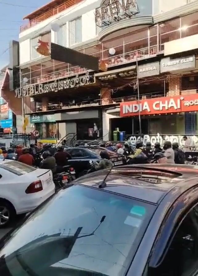 The video showcases a bustling street scene in India. The street is crowded with cars, motorcycles, and auto rickshaws, all navigating through the traffic. Pedestrians are visible, though not prominent. Buildings line both sides of the street, adorned with numerous signs in both English and what appears to be a local Indian language. The signs advertise various businesses, including Arena, India Chai, boutiques, and other shops. The overall atmosphere suggests a busy commercial area in an urban setting.