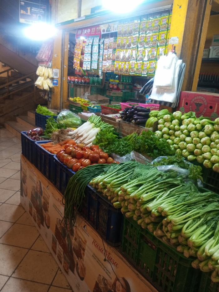 A vibrant market stall overflows with fresh produce. Neat rows of green vegetables dominate the foreground, while colorful tomatoes, carrots, onions, and daikon radishes fill blue crates. Eggplants and chayote squash sit behind. A display of bagged spices lines the stall's back wall, above a countertop filled with citrus fruit and other goods. A staircase can be seen on the left, suggesting the market extends to another level.