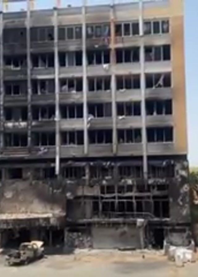 Alright, here is a description of the video. The video shows a large building that has been heavily damaged by fire. The facade of the lower floors is almost completely blackened, and many windows are broken or missing on the upper floors. Debris is scattered on the ground in front of the building. In the foreground, two people are walking on the street. Other buildings and trees can be seen in the background under a clear sky.