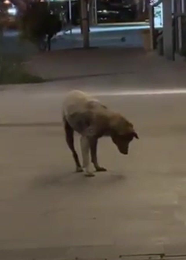 dog standing on a sidewalk at night. The dog is light-colored with patches of darker fur, and appears thin. It is standing with its head down, looking at the ground. In the background, there are streetlights, signs, and buildings, indicating an urban environment. The sidewalk appears to be made of square pavers.
