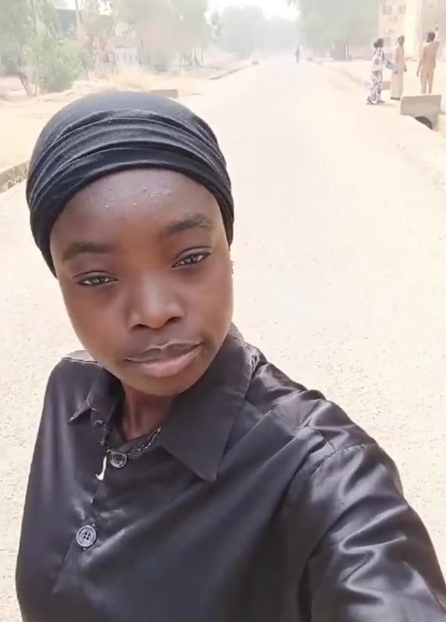 young, dark-skinned person with a black head covering and a black button-down shirt. They are standing outdoors on what appears to be a street or road with trees and buildings in the background. The person holds a dark, feathery object behind their head, resting their cheek on their hand. They are looking directly at the camera with a neutral expression. The scene seems to be recorded during the daytime with slightly hazy conditions. Other people can be seen walking in the background.