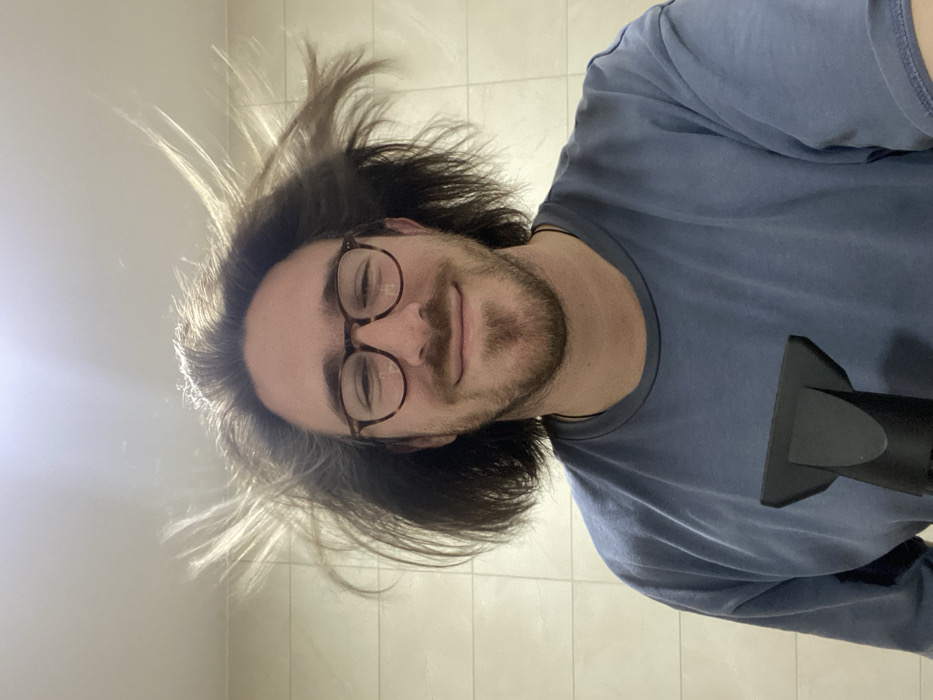 A man with long brown hair and glasses smiles with his eyes closed. His hair is blown upwards by a black hair dryer held in his right hand. He wears a long-sleeved, light blue shirt. The background consists of white tiles. A light source shines from the left, illuminating part of his hair and the wall behind him. The image appears to be a selfie taken in a bathroom.