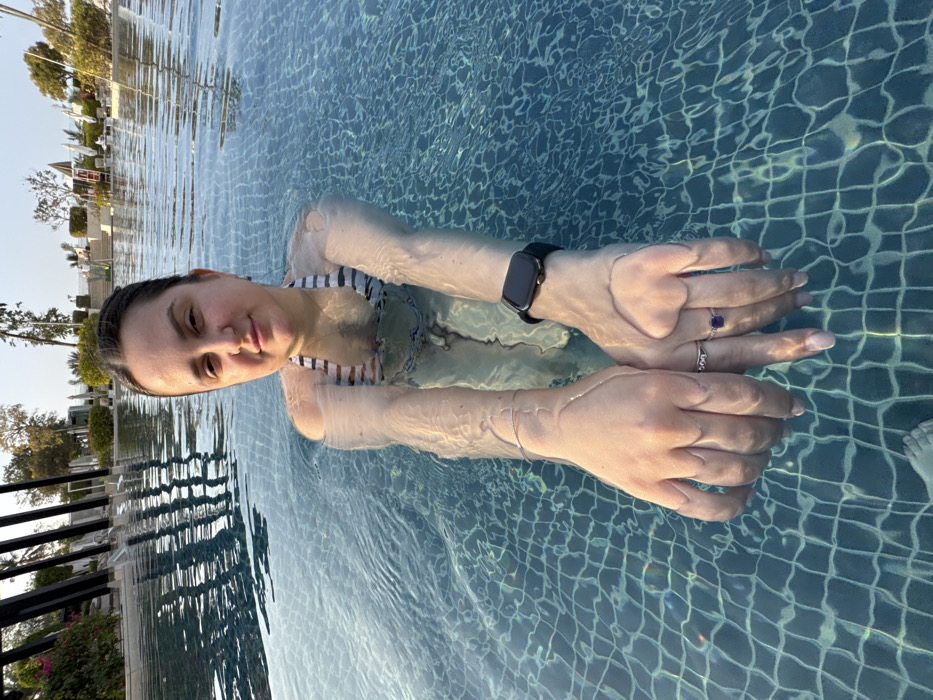 An outdoor scene in Bawshar Province, Oman, depicts a female individual submerged in a swimming pool, facing the camera. Her body is immersed approximately to chest level, with clear water showing ripples around her. The pool floor is visible, tiled with a light blue or green square pattern. The female, with dark hair pulled back, looks directly at the camera with a slight smile. She is wearing a black and white striped bikini top. Her hands are extended forward and downward, submerged in the water, appearing slightly cupped with fingers loosely splayed. On her left wrist, she wears a slender silver-colored bracelet. Her right wrist displays a black smart watch. On her left ring finger, she wears a silver-colored band and a ring featuring a prominent dark blue or purple stone. A single silver-colored band is visible on her right ring finger. In the background, modern architectural structures with dark vertical and horizontal elements are visible to the left. Beyond the pool edge, lush green foliage and trees are present, along with distant light-colored buildings, possibly part of a resort complex, featuring white parasols. The sky overhead is clear and light blue, indicating daylight conditions.