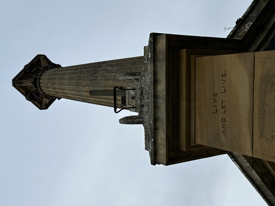 The image displays a weathered stone monument in North Norfolk, United Kingdom, viewed from a low-angle perspective against an overcast, light grey sky. The monument features a light brown, cubic stone plinth at its base. Inscribed on the visible face of this plinth are the carved capital words "LIVE" on the upper line and "AND LET LIVE." on the lower line. The top surface of the plinth is a rough, grey material heavily encrusted with lichen and other biological growth. A dark, corroded metal object, approximately 30-40 cm wide with horizontal bars, is centrally positioned on this upper platform, surrounded by irregular stone elements. Rising from the plinth's platform is a tall, slender, fluted column made of the same light brown stone, tapering slightly towards its apex. The column culminates in an octagonal, ornate capital, displaying weathered, intricate carvings. No individuals, animals, or discernible actions are present in the scene.