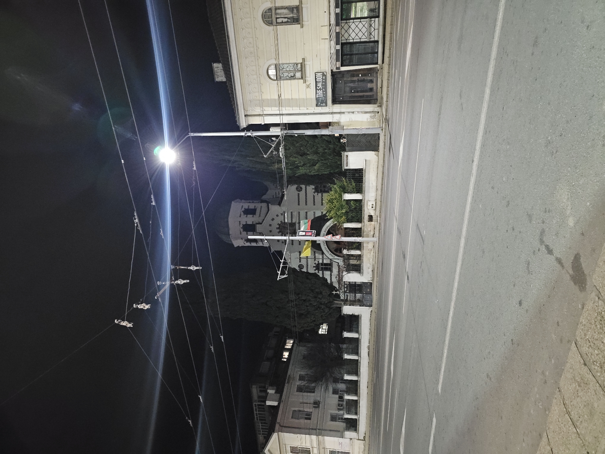 An external night-time photograph depicts a multi-lane asphalt road in Stara Zagora, Bulgaria, looking towards a prominent Orthodox church and adjacent buildings. The road in the foreground is grey with white dashed and solid lane markings and directional arrows, appearing empty of vehicles or pedestrians. A light-colored concrete sidewalk runs along the immediate lower-left edge. On the far side of the road, slightly right of center, stands the "St. Dimitar" Church, characterized by its white facade, grey architectural details, a central dome, and a bell tower. The church is partially obscured by tall, dark evergreen trees and a dark metal fence atop a low stone wall. Two flags, one Bulgarian and one yellow (possibly ecclesiastical), are displayed on the church's facade. A sign with Bulgarian text is visible near the church entrance. To the left of the church, beyond the fence, is a multi-story, light-colored building with numerous windows, some illuminated, suggesting interior activity. Further back and to its left, another taller structure is partially visible. To the immediate right of the church, separated by a light pole, is a two-story, light-yellow building. Its ground floor features a commercial establishment with a sign reading "THE SALOON CAFE BAR" above a dark wooden double door and dark storefront windows. The upper floor has two arched windows with visible internal grates. A tall, grey streetlight pole with a bright luminaire stands prominently in the mid-ground on the right, casting a strong light and lens flare across the dark sky. Overhead, numerous dark power or trolley lines crisscross the upper third of the frame against the black night sky, from which several decorative white, humanoid-like figures or lanterns are suspended. The overall scene is devoid of visible people or active movement.