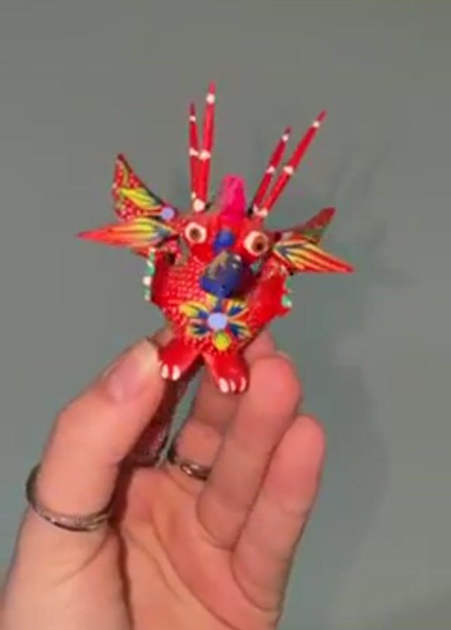 A hand wearing multiple silver rings holds up a small, colorful, hand-carved wooden figurine of a bird. The bird is predominantly red with various other bright colors in floral and abstract patterns. It has wings, a long beak, and multiple upright spikes on its head. The background is a plain light gray wall. The hand rotates the figurine slowly to show different angles.