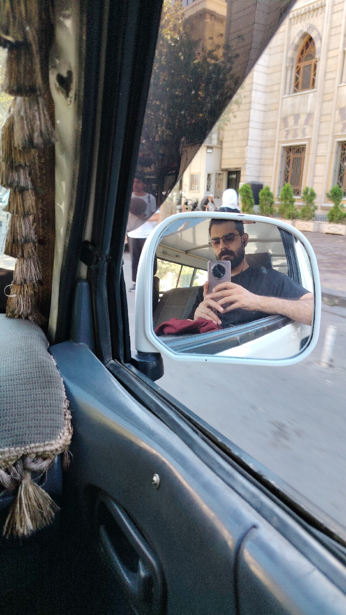 - "The image displays a scene from inside a vehicle, looking out the passenger-side window and reflecting in the exterior side mirror in Sarouja Municipality, Syria" by FM-XBcrw1, licensed under CC BY 4.0