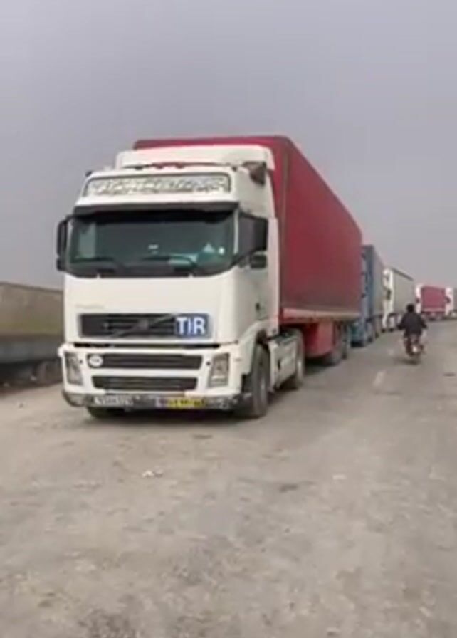 line of semi-trucks parked on the side of a road. The trucks are of various colors, including white, red, and blue. The road is dusty and lined with streetlights. A man on a motorcycle rides alongside the trucks. The sky is overcast and hazy. The vehicles appear to be in Iran, given the license plate of the front truck. The weather is windy.