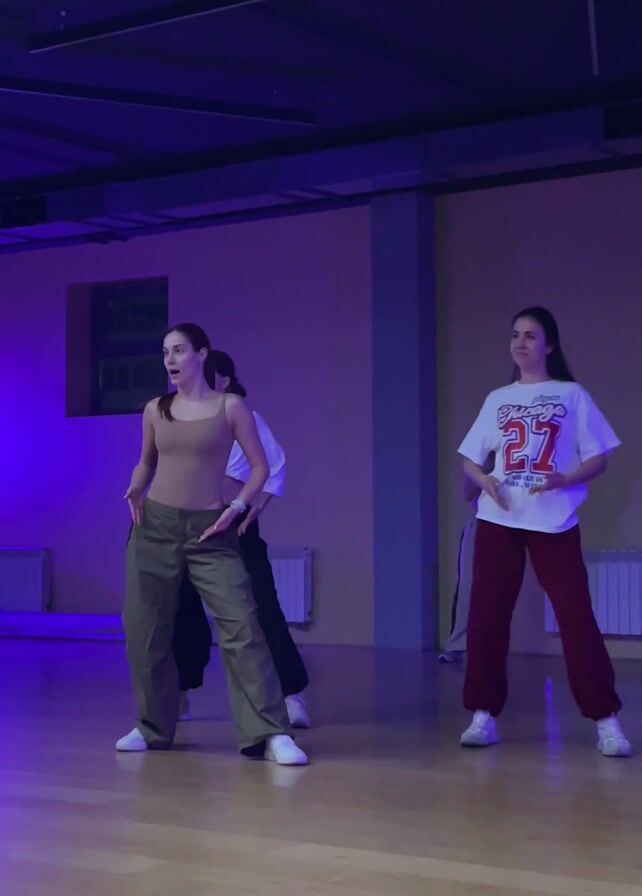 dance studio with three women and one other figure who is mostly out of view. The women are dressed in casual clothes. The woman on the left is wearing a tan tank top and baggy green pants. The woman on the right is wearing a white t-shirt with “Chicago 27” on it and red pants. They are moving their arms in a dance sequence, with a fourth, only partially visible figure in the background. The studio has a wooden floor, a window, and a radiator. The lighting in the room is dim, with some blue lights.