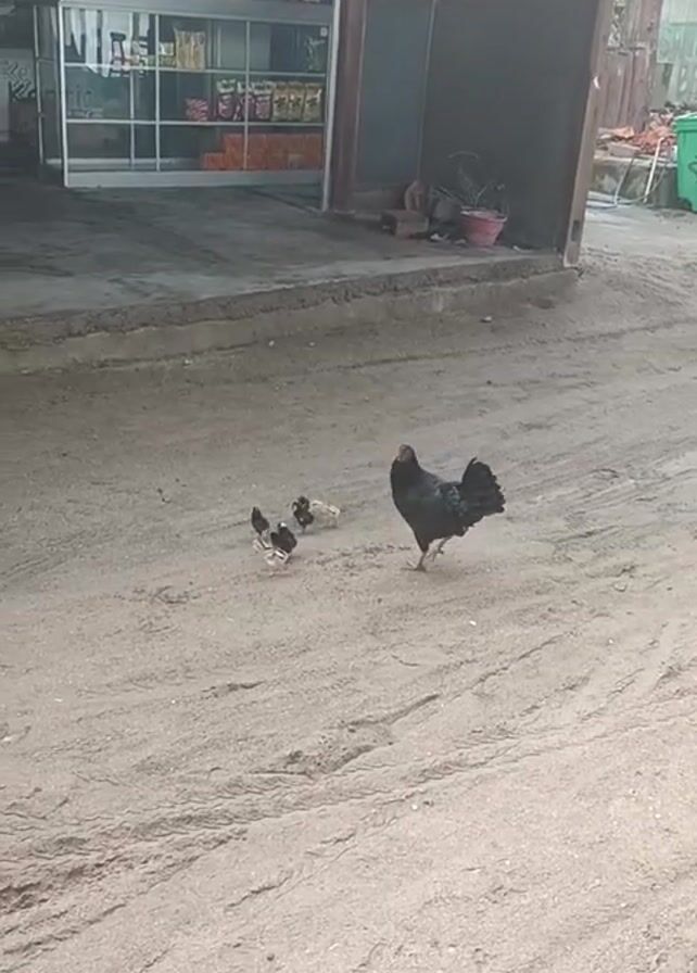 A black hen walks across a dirt path with a flock of six chicks. The chicks are small and appear to be different colors, including black and white. To the left of the hen and chicks is a building with a large display case stocked with items, possibly food or goods. To the right of the hen, there's a dark, open structure with a plant pot visible inside, and further back, a green trash can. The ground is a mix of dirt and sand, showing tire tracks.