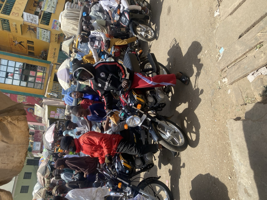 The image displays a congested street scene in Maiburiji, Nigeria, under bright, direct sunlight, evidenced by distinct shadows on the ground