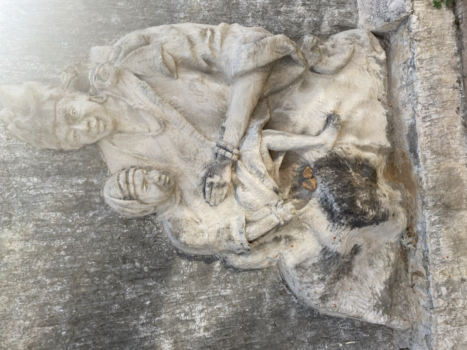 A relief sculpture, carved from a light-colored, weathered material, possibly concrete or stone, depicts two figures