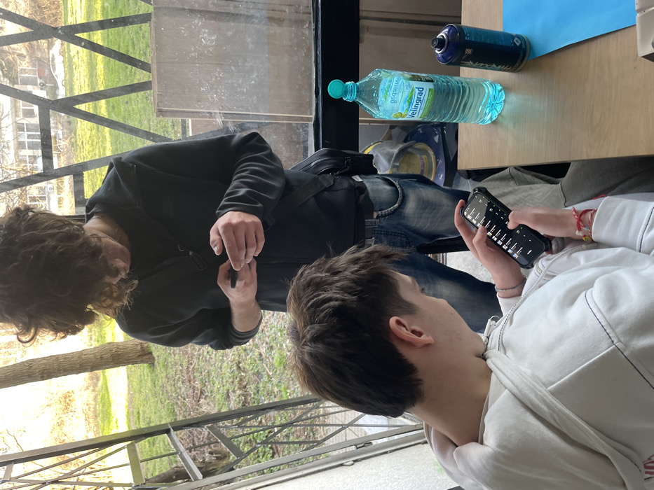 The image displays two males inside a building, observing an outdoor residential area in Sofia, Bulgaria. In the foreground, a young male with short dark hair, wearing a white hooded sweatshirt, is seated and engrossed in a black smartphone held horizontally in both hands, displaying a grid-like interface. He has several colorful bracelets on his right wrist. Standing behind him is another male, with voluminous curly dark hair obscuring his face as he looks down. He is dressed in a black zippered hoodie, blue jeans, and a black shoulder bag, also focusing on a black smartphone. On a light wooden table to the right, a clear plastic bottle of "Velingrad" mineral water with a light blue label and a turquoise cap is present, alongside a dark blue cylindrical spray paint can with a white nozzle. A piece of blue paper is partially visible under the spray can. Through a large window, a green grassy area is visible, with several deciduous trees (some appearing bare, others with light budding) and a distant multi-story residential building. A white car is partially visible behind the building. A black metal lattice structure is positioned outside the window on the left. Both individuals are focused on their respective mobile devices, with no direct interaction between them. The setting suggests an indoor space with a view of a typical residential park or communal green space in Sofia.