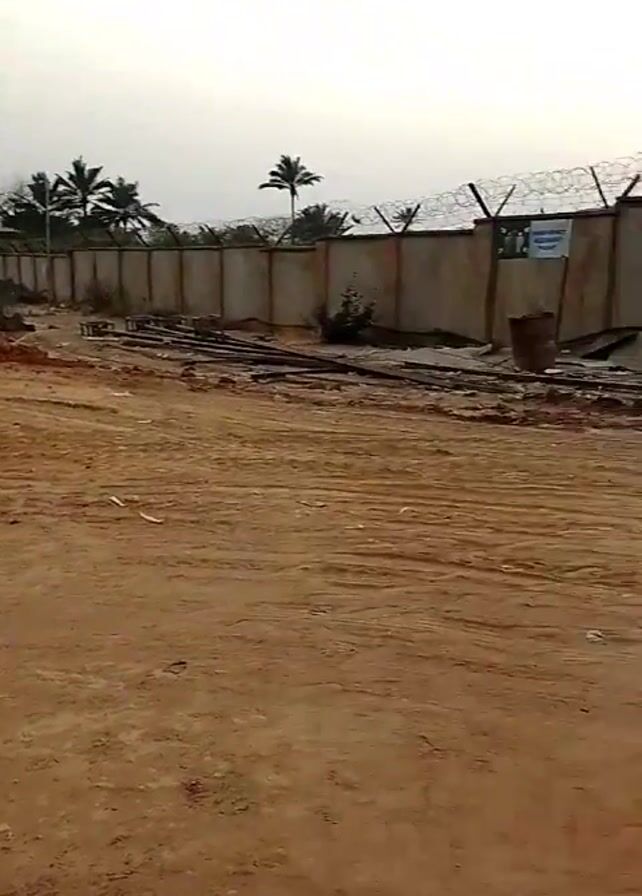 dirt lot enclosed by concrete walls topped with barbed wire. There's a metal gate with a concrete post. Palm trees are visible in the background. Several large vehicles are parked in the distance beyond the gate. Debris and discarded items are scattered around the lot. One person is briefly visible walking near a small shed. The sky is overcast. The footage appears to be taken with a mobile phone.