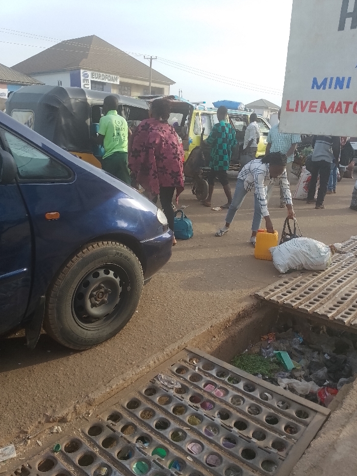 A bustling street scene is captured, filled with people, vehicles, and commercial activity. In the foreground, a dark blue car is parked near a storm drain filled with trash. Several individuals are gathered, some waiting for rides in auto rickshaws, while others are preoccupied with their belongings. A building with the name "EUROFOAM" is visible in the distance. A sign advertising live matches is partially visible on the right. The overall impression is one of a busy marketplace or transportation hub in an urban setting.