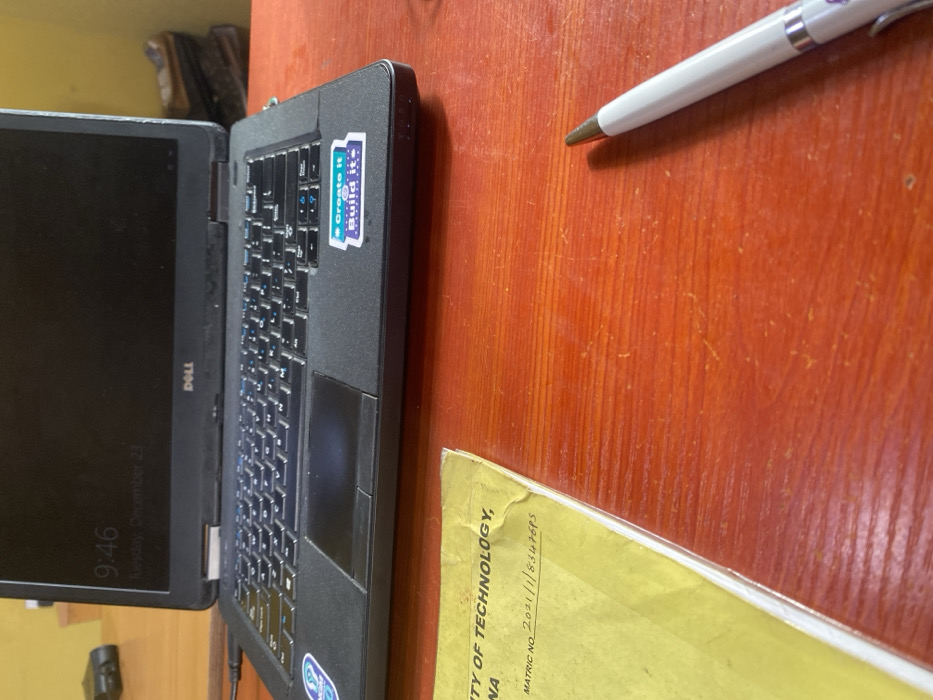 A black Dell laptop, its screen displaying "9:46 Tuesday, December 23," rests on a reddish-brown wooden table with visible grain. The laptop features a discernible keyboard and trackpad, with "Create It, Build It" and a partial blue sticker affixed to its palm rest. To the left, a yellow-covered document or notebook is partially visible, displaying text fragments including "SITY OF TECHNOLOGY," "ONA," and "MATRIC NO. 2021/1/83476PS." A white and silver pen with a dark tip lies on the table to the right. The background consists of a blurred light brown wall, with indistinct dark objects visible in the upper left and right corners. This scene depicts a student's workstation or study area within an academic institution, likely a University of Technology, in Egan, Nigeria.