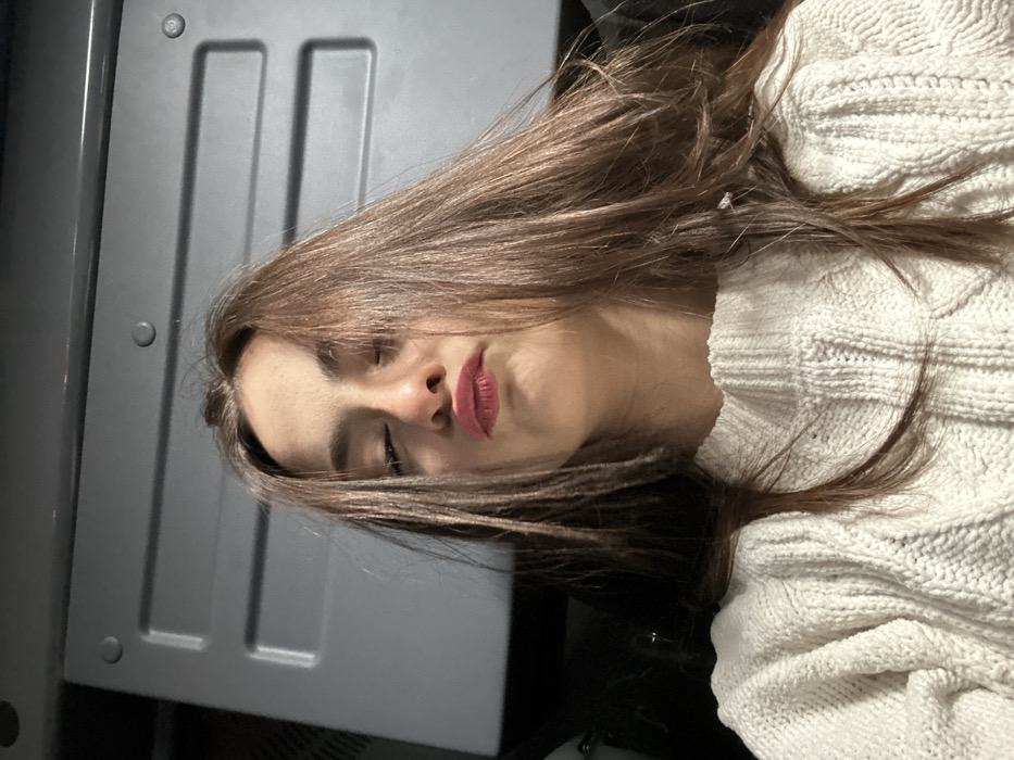 - "A young woman with closed eyes and light brown hair poses sideways in a white cable-knit sweater" by FM-vVQbp1, licensed under CC BY 4.0