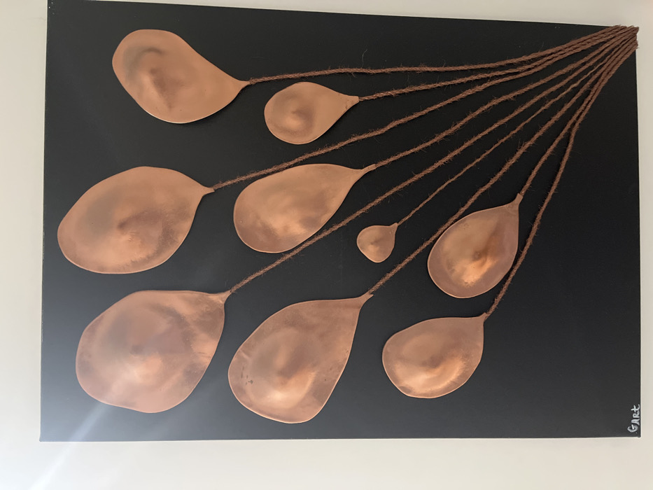 The image displays an artwork mounted on a light-colored wall, presumably situated within an interior space in Dos Hermanas, Spain. The artwork is a rectangular mixed-media relief featuring nine distinct, convex, irregularly shaped metallic elements against a matte black background. These elements vary in size, ranging from approximately 3 cm to 15 cm in length, and exhibit a burnished, copper-toned finish with reflective highlights, particularly in the upper left quadrant. From the lower, narrower point of each metallic shape, a separate strand of brown, twisted string or twine extends downwards and converges towards the bottom-right of the black panel. The inscription "GArt" is visible in white lettering in the bottom-left corner of the black background. No individuals, discernible actions, or additional objects are depicted in the scene.