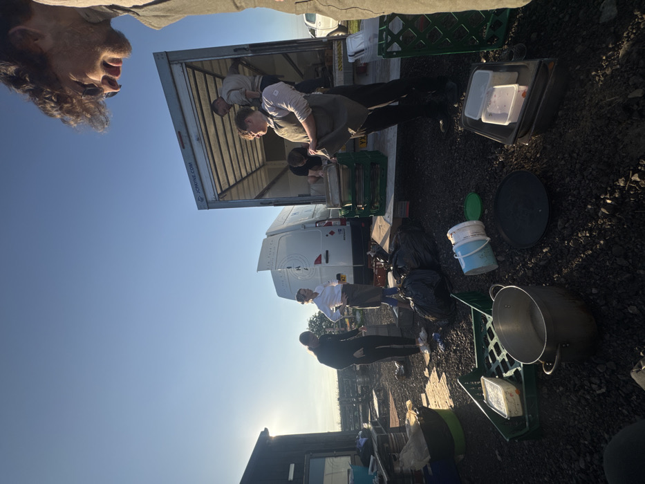 The image captures an outdoor commercial or service yard in Northallerton, United Kingdom, under a clear, bright sky casting long shadows. The ground surface is gravel. Five individuals are visible. In the foreground on the right, a man with curly hair and sunglasses resting on his head looks downward towards the scene. Center-right, a man in a light-colored shirt and dark apron stands in front of a large white box truck with its rear door open, holding a metal tray above a stack of green plastic crates. Two additional men are inside the truck's cargo area; one is bent over, handling crates, while the other stands further inside. Behind them, a white panel van, branded "NORTHALLERTON / YORKSHIRE FOOD CO" and bearing a partial UK license plate beginning "YZ", is parked. To the left of the box truck, a woman in a white shirt and dark apron stands with her hands on her hips, holding a yellow cup. Further left, adjacent to a dark-colored shed or building, another woman in dark attire stands partially facing away from the viewer. The ground in the foreground is occupied by various items, including multiple green plastic crates, three black refuse bags, a large metal cooking pot, a light blue plastic bucket lying on its side with a green lid, a black circular pan, and stacked white plastic food containers. The overall scene suggests a loading, unloading, or clean-up operation associated with a food service enterprise.