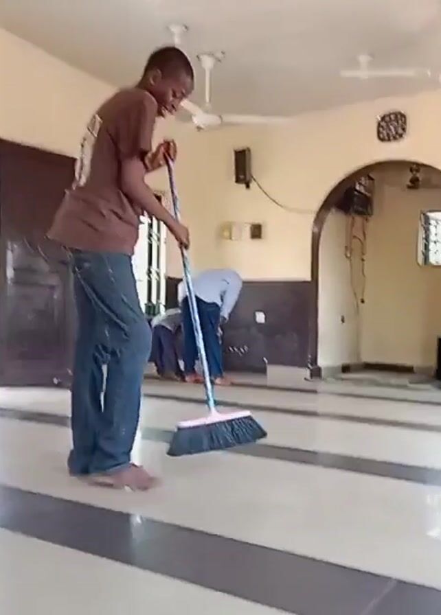 In an indoor setting, a slender, dark-skinned young man sweeps a glossy, tiled floor with a pink and black broom. He wears a brown t-shirt and dark jeans and is barefoot. Behind him and to the right, another person bends over, apparently cleaning near an arched doorway. Around the room, several other people are visible, some standing and some sitting on the floor. The room has ceiling fans, windows, and pictures on the wall. The overall lighting in the room appears bright.