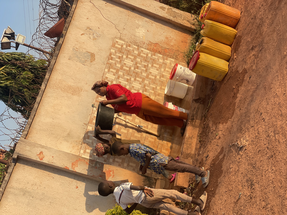 The image captures an outdoor scene in Barakin Lerawi, Nigeria, during late afternoon sunlight, evidenced by long shadows. An adult female, dressed in a red short-sleeved top, brown trousers, and a patterned headscarf, holds a large dark basin under an active spigot mounted on a tiled section of a light-colored concrete wall. A smaller child, partially obscured behind the basin, also appears to be participating in holding it. Two other children observe the activity: one boy in a white shirt and light pants stands with his hand on his hip, while another boy in a patterned blue shirt and dark pants stands closer to the spigot. On a raised concrete ledge, three white plastic buckets are visible, two with red lids. Five plastic Jerry cans, primarily yellow with one orange, all topped with red caps, are aligned on the reddish-brown dirt ground in the foreground. The ground shows wet areas near the spigot. The concrete wall, exhibiting cracks and discoloration, is topped with coiled barbed wire. A solar-powered floodlight on a pole, partially obscured by green foliage, is visible above the wall.