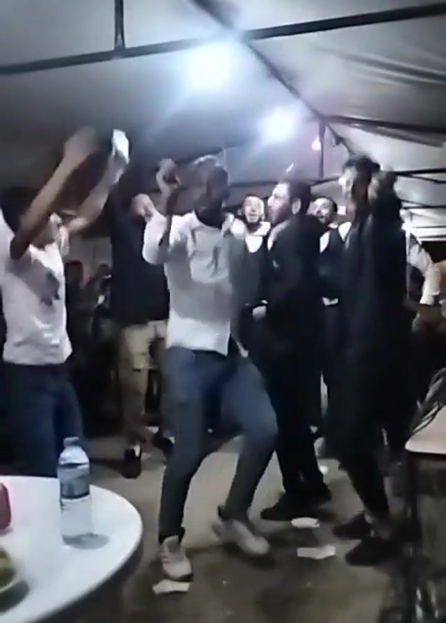 group of men dancing at an indoor event that appears to be a celebration or party. The location is covered by a white tent-like structure, under bright overhead lights. About a dozen men are visible, dressed in various casual styles – shirts, pants, and jackets. Several are actively dancing, moving their arms and legs in a synchronized fashion. On a white table in the foreground, there is a bottle of water and a small plate. The floor appears to be concrete, littered with what seems to be pieces of paper. The atmosphere is lively, with loud music or singing audible in the background.