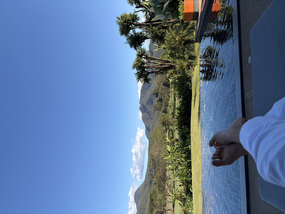 The image displays an outdoor scene in Pai, Thailand, under a clear blue sky with sparse white cumulus clouds. In the lower foreground, a pair of bare feet and lower legs, partially covered by a white garment, rest on a dark grey lounge chair. An infinity-edge swimming pool, tiled in dark blue, occupies the mid-foreground, its surface reflecting the sky and exhibiting ripples. To the immediate right of the pool, a dark tiled border connects to an orange-brown planter containing green foliage. Beyond the pool, a bright green lawn extends to a landscape of lush tropical vegetation, including various trees and cultivated fields. A range of forested mountains forms the distant background.