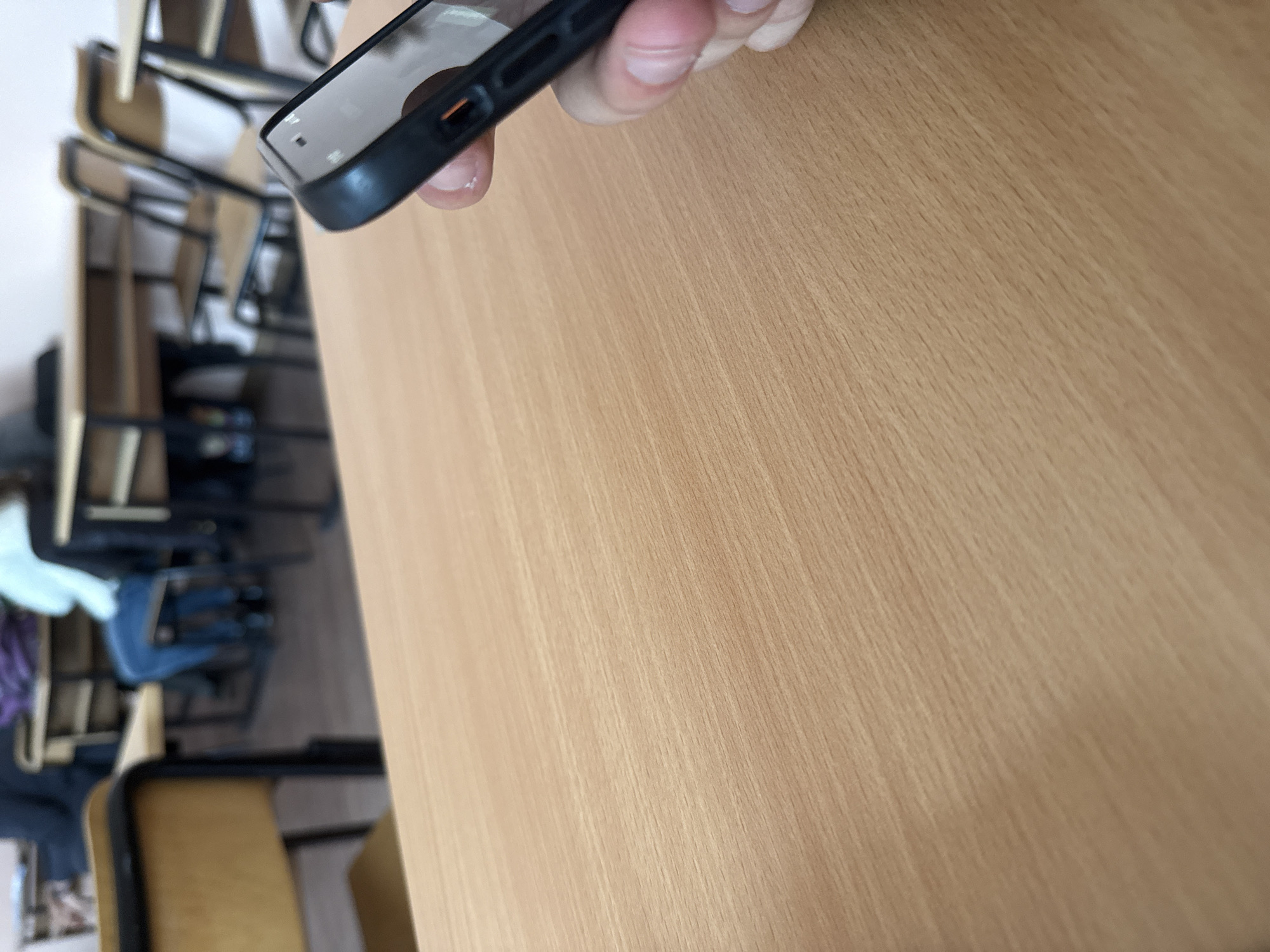 The image depicts an indoor scene within a classroom, identified as being located in Sofia, Bulgaria. The foreground is dominated by a light-colored wooden desk surface, clean and free of objects. In the lower right portion of the frame, a human right hand holds a black smartphone, angled slightly away from the viewer. The phone's screen reflects ambient light, and a small rectangular cutout revealing an orange interior (likely a port or button) is visible on its right side. The background is out of focus, revealing multiple classroom desks and chairs. These desks feature light brown wooden tops and dark metal frames. The chairs similarly have light brown wooden seats and backs supported by dark metal frames. Several individuals are seated at these desks; however, their features are obscured by the blur. One person in the mid-left background is observed wearing blue jeans and a light-colored shirt. Another individual further back appears to be wearing a dark, possibly purple, garment. The room's flooring is a light hue, and the walls are light-colored. The overall environment suggests an active educational setting.