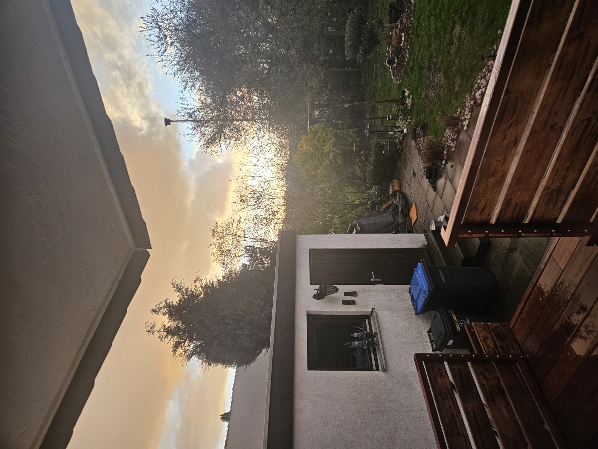 The image depicts an outdoor scene in Konz, Germany. The view is from an elevated position, likely a balcony. A residential building is visible with a white exterior wall, a window with figurines inside, and a dark brown door. Adjacent to the building are two wheelie bins, one black and one blue. The landscape includes trees, grass, and a patio area with stone paving. Some garden decorations are visible among the trees. The sky is partially visible with clouds illuminated by the setting or rising sun. The wooden balcony is in the foreground, wet from rain.