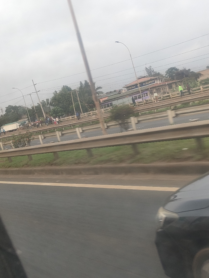 The image displays an outdoor, daytime scene in Kiuu ward, Kenya, captured from the interior of a moving vehicle. The immediate foreground features the front right quarter of a dark-colored vehicle, including its headlight and partial hood, positioned on a multi-lane asphalt roadway marked with a white line. This roadway is separated by a series of parallel, metal guardrails from a grassy median or shoulder area. Beyond the guardrails, a secondary road or shoulder is visible, populated by numerous pedestrians. On the left, a white commercial truck, possibly a box truck, is parked or moving slowly, with a cluster of individuals nearby. In the mid-ground, a two-story building with a distinctive purple lower section and a brown upper section is prominent. The building's facade clearly displays the text "SYNTAX ACADEMY" in white capital letters. Several pedestrians are observed walking or standing in front of this building, one of whom is distinctly wearing a bright green upper garment. The environment includes multiple utility poles, lampposts with overhead lines, and a variety of trees and bushes. The sky overhead is overcast, indicating diffused daylight conditions.