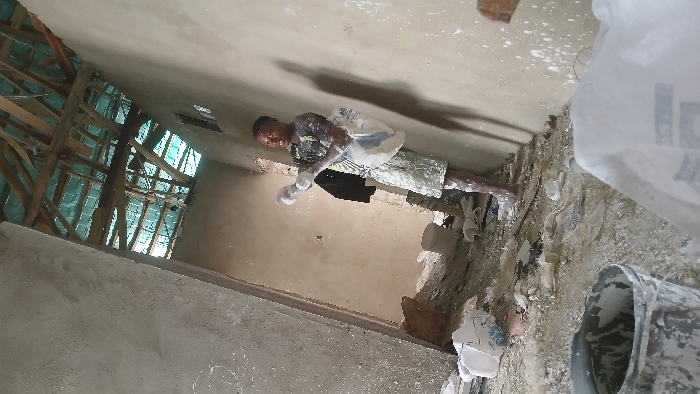 The image depicts the interior of an unfinished structure located in the city of Unknown, Unknown. A single male individual, appearing to be a young adult with dark skin, stands barefoot and is extensively coated in white powder on his skin, hair, and clothing. He wears a dark, splattered t-shirt and patterned shorts. The subject holds a large white bag, also covered in powder, over his left shoulder, with his hands raised in front of him, heavily coated in the same white substance. He displays a smiling facial expression directed towards the camera. The environment shows rough, unpainted concrete walls with visible sections of exposed brickwork or broken plaster. The ceiling features exposed wooden roof trusses with a green translucent sheeting visible above. The floor is heavily covered with scattered white powder and construction debris, including discarded white plastic bags and fragments of material. In the lower left foreground, a grey bucket containing white liquid or slurry is partially visible. A dark garment is suspended from a protrusion on the wall directly behind the individual.