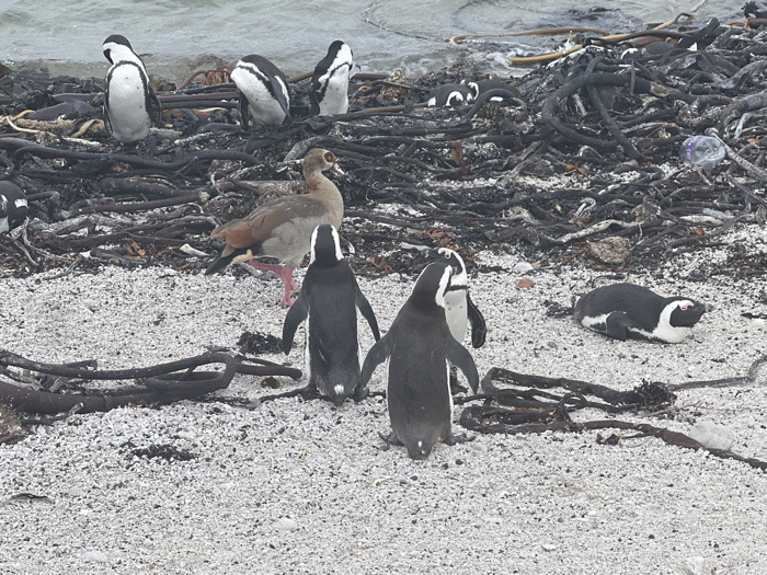 A group of African penguins populates a beach with dark seaweed debris. Several penguins stand upright, while one rests prone. Among them, an Egyptian goose walks with one leg raised. The beach is pebbly, and the ocean is visible in the background, with overcast weather conditions. A clear plastic bottle rests among the seaweed.