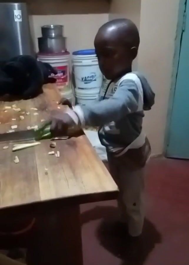 A small child with a shaved head is standing at a wooden table, chopping a green vegetable with a large knife. The child is wearing a grey and white hoodie, and light-colored pants. The table has pieces of chopped vegetables scattered on it. In the background, there are several containers on a shelf, a silver cylinder, and a black stuffed animal on the table. A blue door is partially visible in the background. The floor is red.