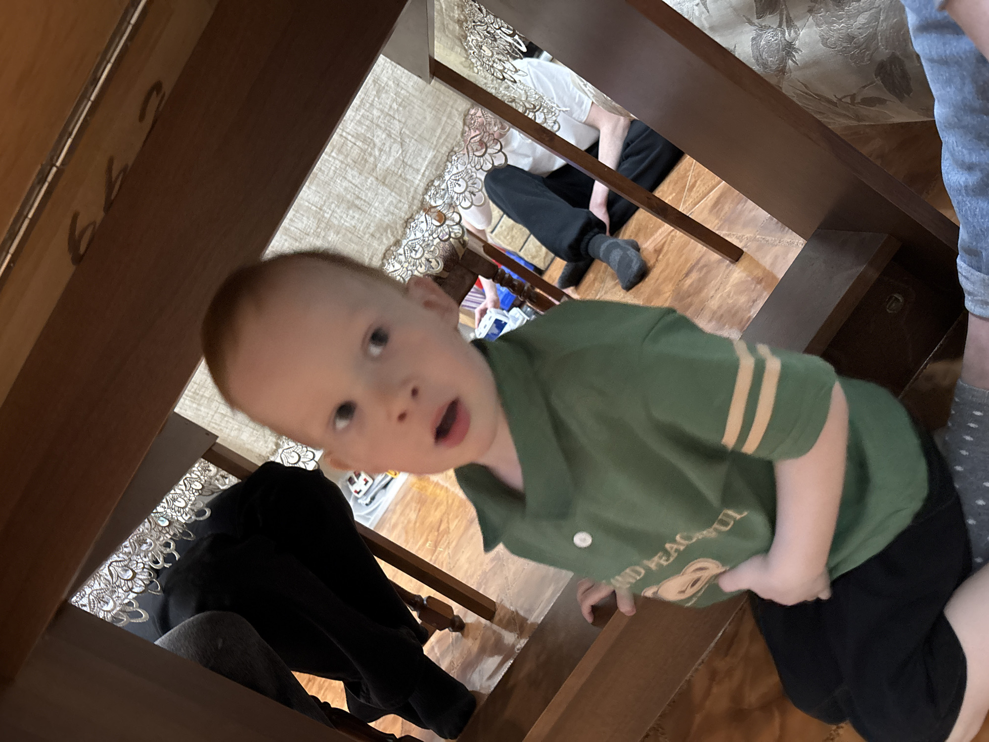 A low-angle shot shows a young child in a green striped shirt and black pants looking upward in Ферма, Russia. The child is situated under a brown wooden structure with visible writing. Other people are present in the background, including an individual in a white shirt and black pants. The environment includes a patterned rug, possibly on a bed or furniture, and the floor appears to be tiled.