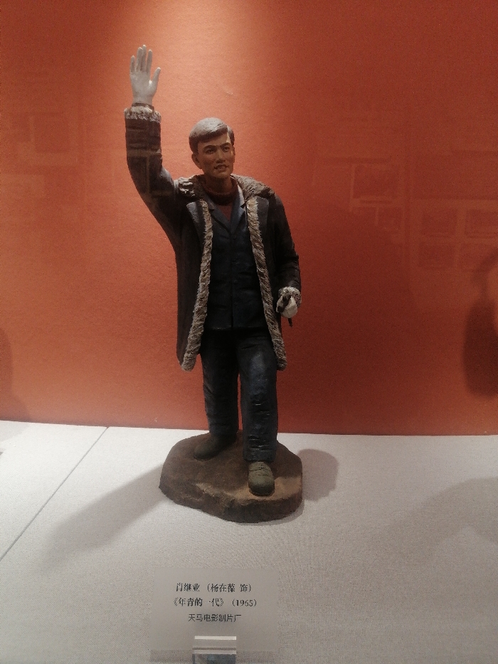 An indoor photograph captures a full-body figurine of a male figure on display within an exhibition in Fengtai District, China. The figurine, approximately 1-2 feet in height, depicts a young East Asian male with short dark hair and a slight smile. He is dressed in a dark, long coat with visible fur trim on the collar and cuffs, a dark blue suit jacket, dark trousers, and a reddish-brown high-neck shirt. His right arm is raised directly upward, palm open and facing forward, as if waving. His left hand, resting at his side, holds a small, dark object with a white cuff. The figurine stands on an irregular, textured dark brown base. It is positioned on a light grey, flat display surface, casting a distinct shadow to its left, indicating illumination from an upper-left source. The background is a plain reddish-orange wall with faint, rectangular textural variations. In the lower foreground, a clear acrylic plaque displays Chinese text: "肖维业 (杨在葆 饰)" (Xiao Weiye, played by Yang Zaibao), "《年轻的一代》 (1965)" ("The Younger Generation," 1965), and "天马电影制片厂" (Tianma Film Studio).