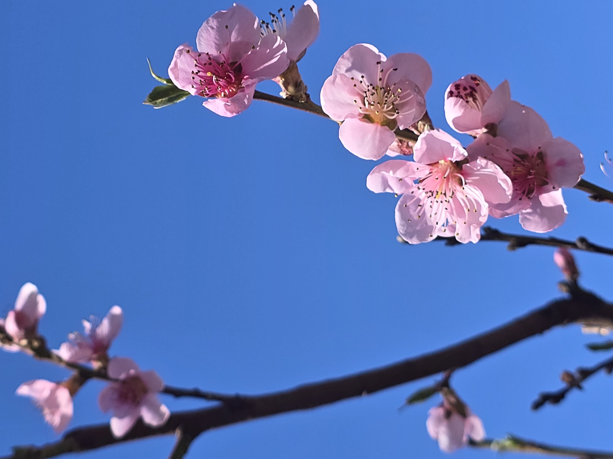 Pink blossoms bloom on a dark branch against a clear blue sky